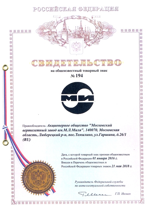 Так же предприятие получило свидетельство на общеизвестный товарный знак, эскиз к которому рисовал сам М. Л. Миль: